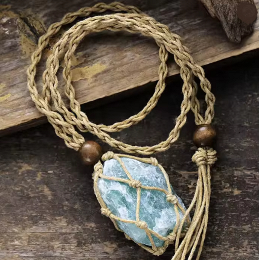 Tento jedinečný náhrdelník z přírodního Amazonitu není jen krásný doplněk – je to kámen naděje, klidu a nových začátků. Surový amazonit je zasazen do ručně pletené síťky, která podtrhuje jeho přirozenou krásu a dodává šperku autentický boho charakter.