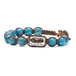 Korálky z apatitu o velikosti 8 mm v jemných modrých odstínech působí klidně, svěže a zároveň elegantně. Modrý apatit je tradičně spojován s komunikací, motivací a schopností formulovat myšlenky i pocity bez vnitřního chaosu. Pomáhá pročistit zmatek, snížit podrážděnost a otevřít prostor pro klidné a vědomé rozhodování. Dominantním prvkem je tibetský váleček o velikosti 9 × 17 mm, zdobený symbolem vadžry (varže). Tento symbol představuje nezlomnou sílu, ochranu a jasnost mysli. V kombinaci s apatitovou energií vytváří silný nástroj – propojuje myšlení, intuici a vnitřní stabilitu. Ručně pletené provedení umožňuje nastavení velikosti na 17–21 cm, takže náramek pohodlně sedí a přizpůsobí se každodennímu nošení.