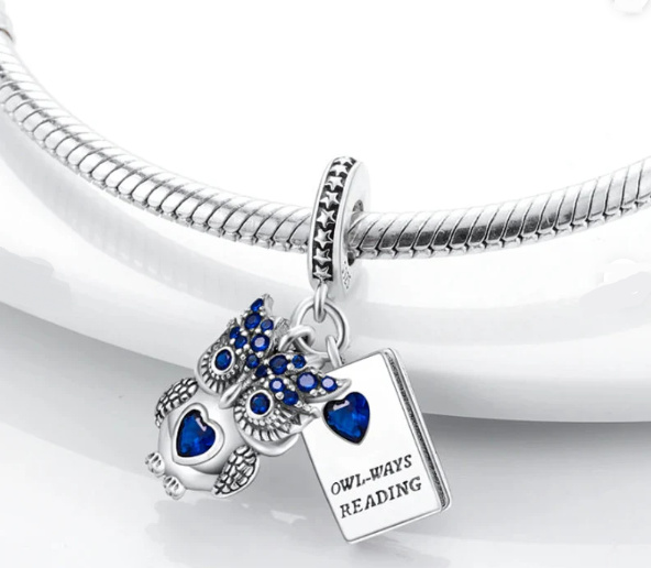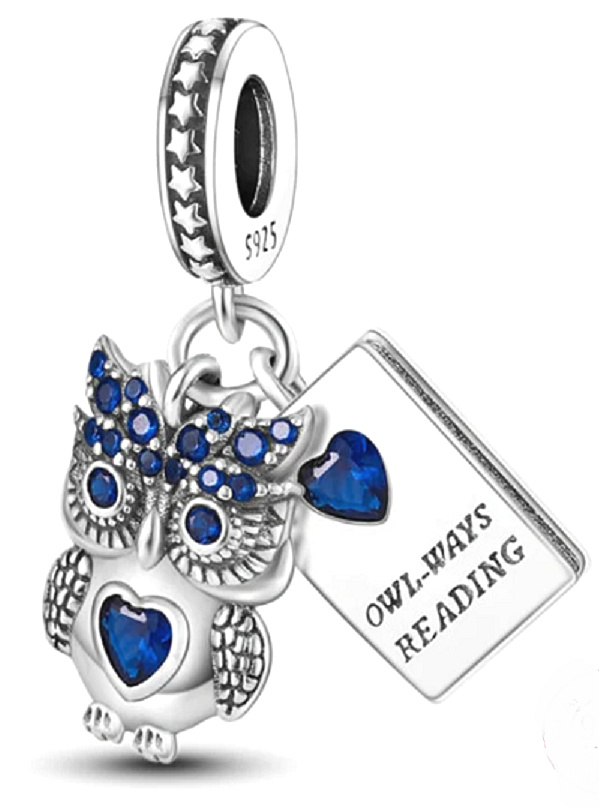 Dvojitý přívěsek s knihou s vyrytým nápisem „owl-ways reading“ a krásnou sovou navrženou s modrými třpytivými drahokamy Zirkonu. Sovička i kniha jsou opatřeny modrým Zirkonem ve tvaru srdce. Sovy symbolizují moudrost, intuici a inteligenci a knihy symbolizují znalosti a vzpomínky