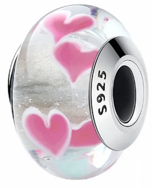 Luxusní a propracovaný korálek v podobě Murano skla zdobeného srdíčky. Obdarujte sebe nebo své blízké tímto kouzlem.