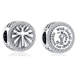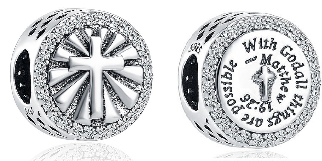 Elegantní korálek s malým křížkem a duchovním biblickým citátem: "U Boha je všechno možné - Matthew - Matouš 19:26" (U Boha = ve víře je všechno možné - Matouš 19:26). Šperk je velmi detailně navržený, kolem dokola prořezávané a malé vyražené kousky Herzen. Krásný symbol lásky a silné důvěry v božskou kreativitu.