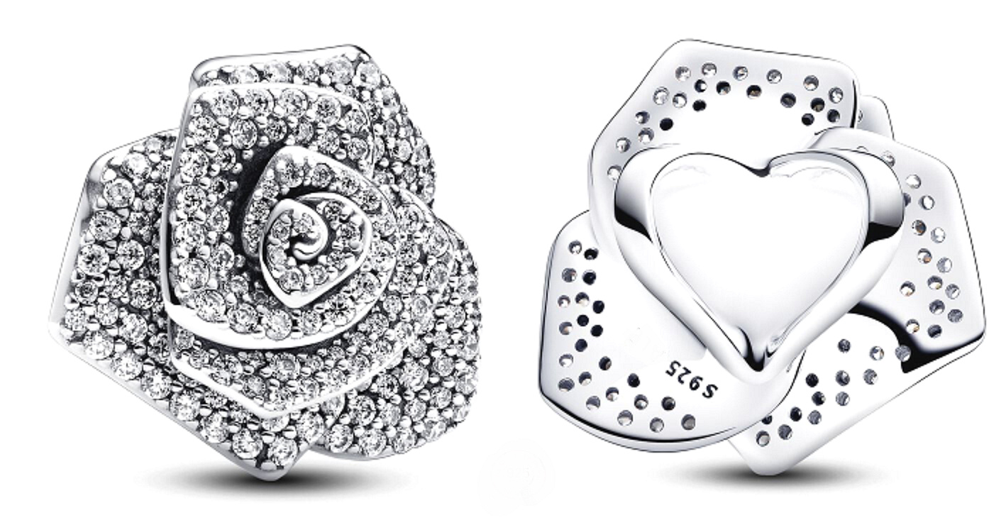 Dodejte lesk s nadměrným přívěskem. Tento poutavý kousek se vyznačuje složitým motivem nadměrné velikosti růží s asymetrickými vrstvami, zdobený 38 mikro a 149 korálky vsazenými čirými kubickými Zirkony pro oslnivý efekt. Přívěsek má funkční otvory pod každým okvětním lístkem a také dva otvory ve tvaru stonku na zadní straně, které umožňují jemný průchod řetízku. Větší než ostatní přívěsky s průměrem 20 mm, plynule vylepšuje jak náramky, tak náhrdelníky. Přijměte nadčasový symbol lásky s tímto nádherným kouzlem růže.