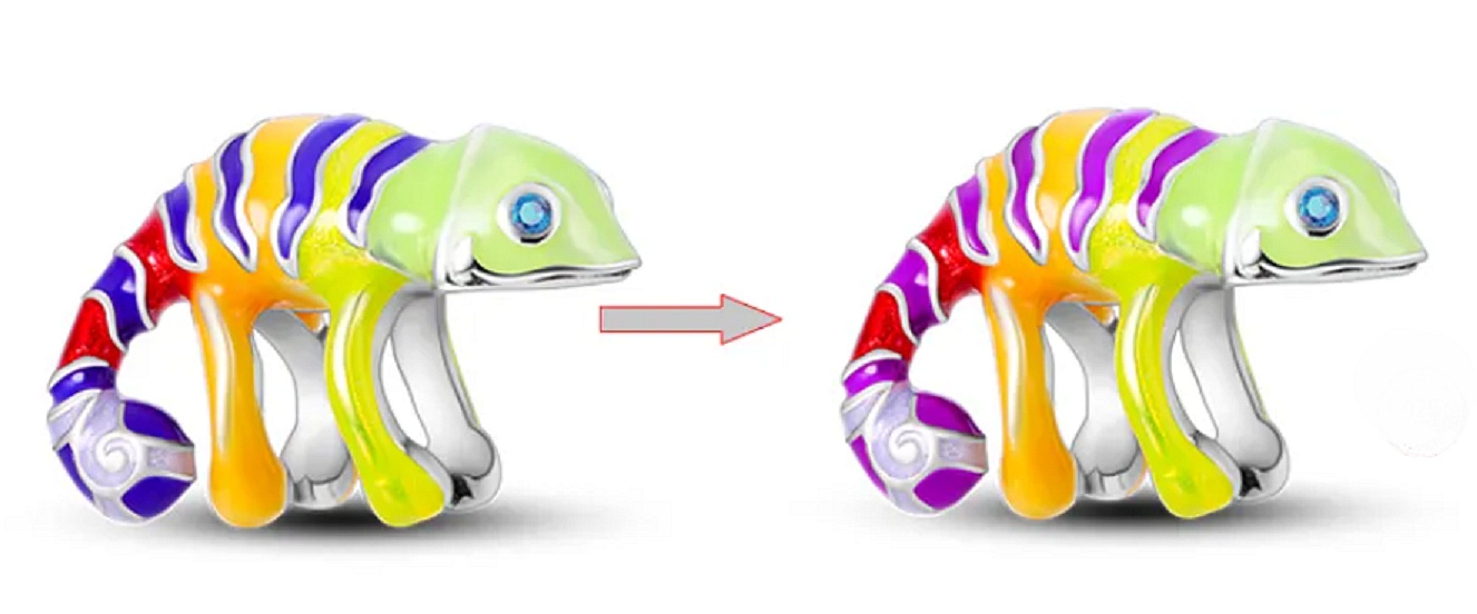 Jeho termochromatický smalt je tím, co ho dělá jedinečným. Roztomilým Chameleonem měnící se barvy, navržený s hladkým barevným smaltem. Pruhy malého Chameleona ve skutečnosti mění barvu od světle fialové po tmavě fialovou v závislosti na teplotě. Chcete-li změnit teplotu, stačí kouzlo zakrýt rukou a teplo vašeho vlastního těla by mělo změnit barvu chameleonových pruhů.