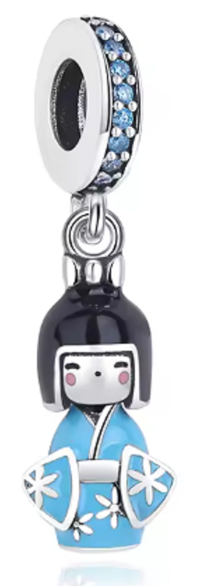 Nechte se okouzlit jemnou krásou japonské kultury s tímto elegantním přívěskem ve tvaru tradiční panenky Kokeshi. Přívěsek je ozdoben precizním modrým smaltem a doplněn jemnými kamínky na závěsném očku. Kokeshi panenky symbolizují přátelství, lásku a ochranu – jsou ideálním talismanem pro každodenní nošení.