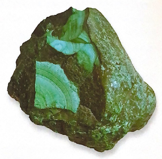 • malachit (zelený), (zelenočerný) obroušený odráží světlo a odhalí tmavé a světlé proužky, může být obrušovaný nebo leštěný