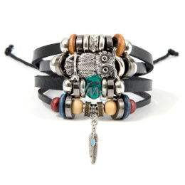 Leather multi-layer bracelet, owl + feather symbol, adjustable size