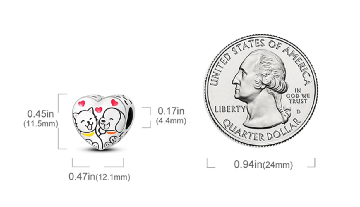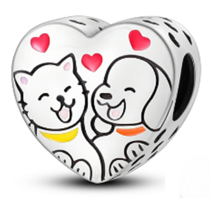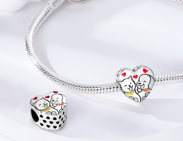 Přívěsek ve tvaru srdce s kočkou a psem, kteří se společně usmívají a nad nimi malými červenými smaltovanými srdíčky. Po stranách přívěsku jsou kolem dokola malá srdíčka s prolamovaným designem. S každým přívěskem vyprávějte svůj příběh a vytvořte náramek, který odráží, kdo jste a co je pro vás důležité. Tvůj styl. Váš náramek. Tvůj příběh.