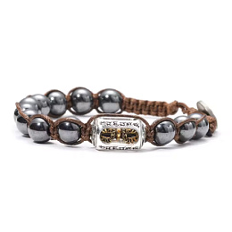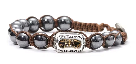 Lesklé korálky o průměru 8 mm z Hematitu působí čistě, moderně a zároveň dodávají pocit stability a pevnosti. Jsou navlečeny na ručně pletené šňůrce, která umožňuje pohodlné nastavení velikosti na obvod ruky 17–21 cm. Dominantním prvkem je středový váleček o velikosti 9 × 17 mm, zdobený pravděpodobně symbolem vadžry (dorje). Tento prvek není jen dekorace – v tibetském buddhismu slouží jako ochranný a posilující symbol, který představuje nezlomnou sílu, jasnost mysli a schopnost obstát i v náročných situacích.
